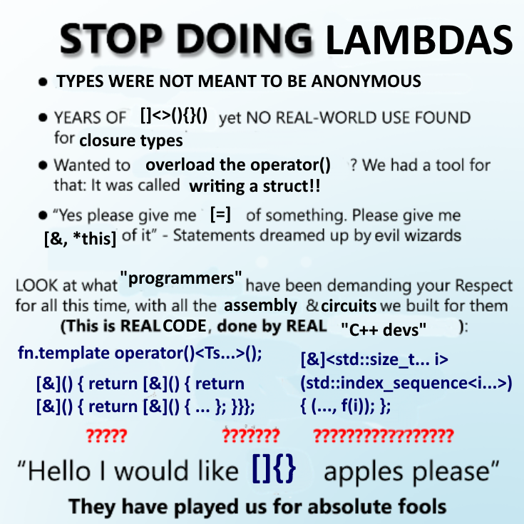 ## Lambdas * Introduced in C++11 * The world has been worse-off ever since