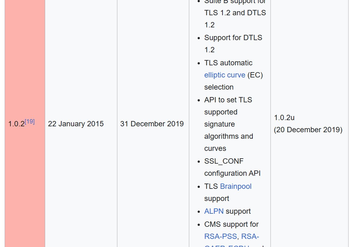## OpenSSL 1.0.2 * https://openssl-library.org/news/vulnerabilities-1.0.2/ * Out of support on 2019-12-31
